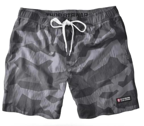 Krátší koupací šortky Thor Steinar pro horké letní dni, kratší a užší střih, široká guma v pase je doplněna stahovací šňůrkou, všitá podšívka ze síťoviny, dvě boční kapsy, zadní kapsa na zip, gumový patch na nohavici