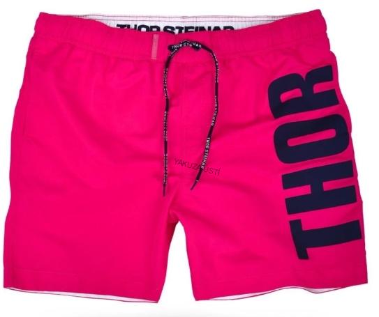 Krátší koupací šortky Thor Steinar pro horké letní dni, kratší a užší střih, široká guma v pase je doplněna stahovací šňůrkou, všitá podšívka ze síťoviny, dvě boční kapsy, zadní kapsa, velký potisk na nohavici