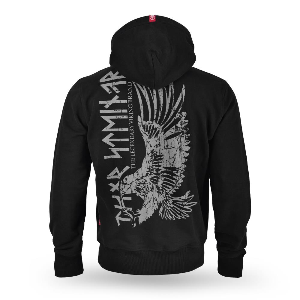 KPZ Heddal, Vikingská mikina Thor Steinar s kapucí, nízký zip, mikina nemá zapínání do kapuce, dvojitě prošitá kapuce se štítkem na lemu,dolní lem a manžety rukávů jsou vyrobeny z kvalitního úpletu, dvě boční kapsy, pevný hlavní zip, velká tištěná aplikace na zádech, malé vyšité logo na hrudi, všitý štítek v bočním švu