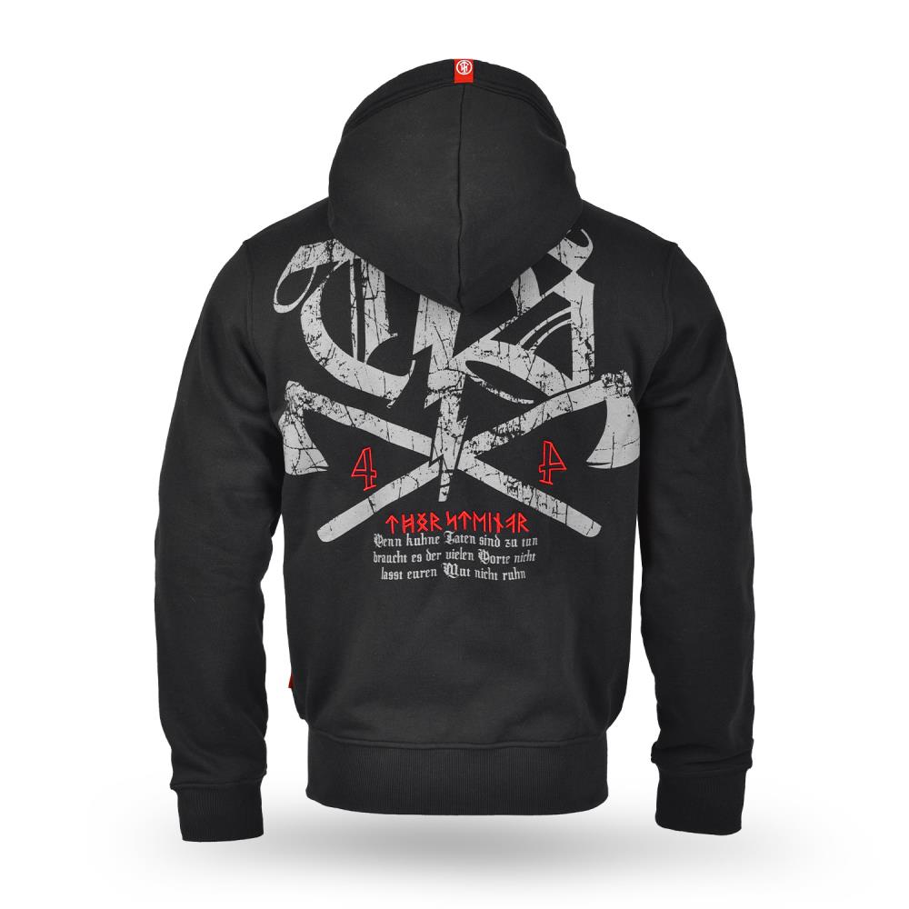 Mikina Thor Steinar s kapucí, dvojitě prošitá kapuce se štítkem na lemu, dolní lem a manžety rukávů jsou vyrobeny z kvalitního úpletu, dvě boční kapsy, pevný hlavní zip, velká aplikace potisku a výšivky na zádech, vyšitý runový nápis na rukávu, malé vyšité logo na hrudi, všitý štítek v bočním švu