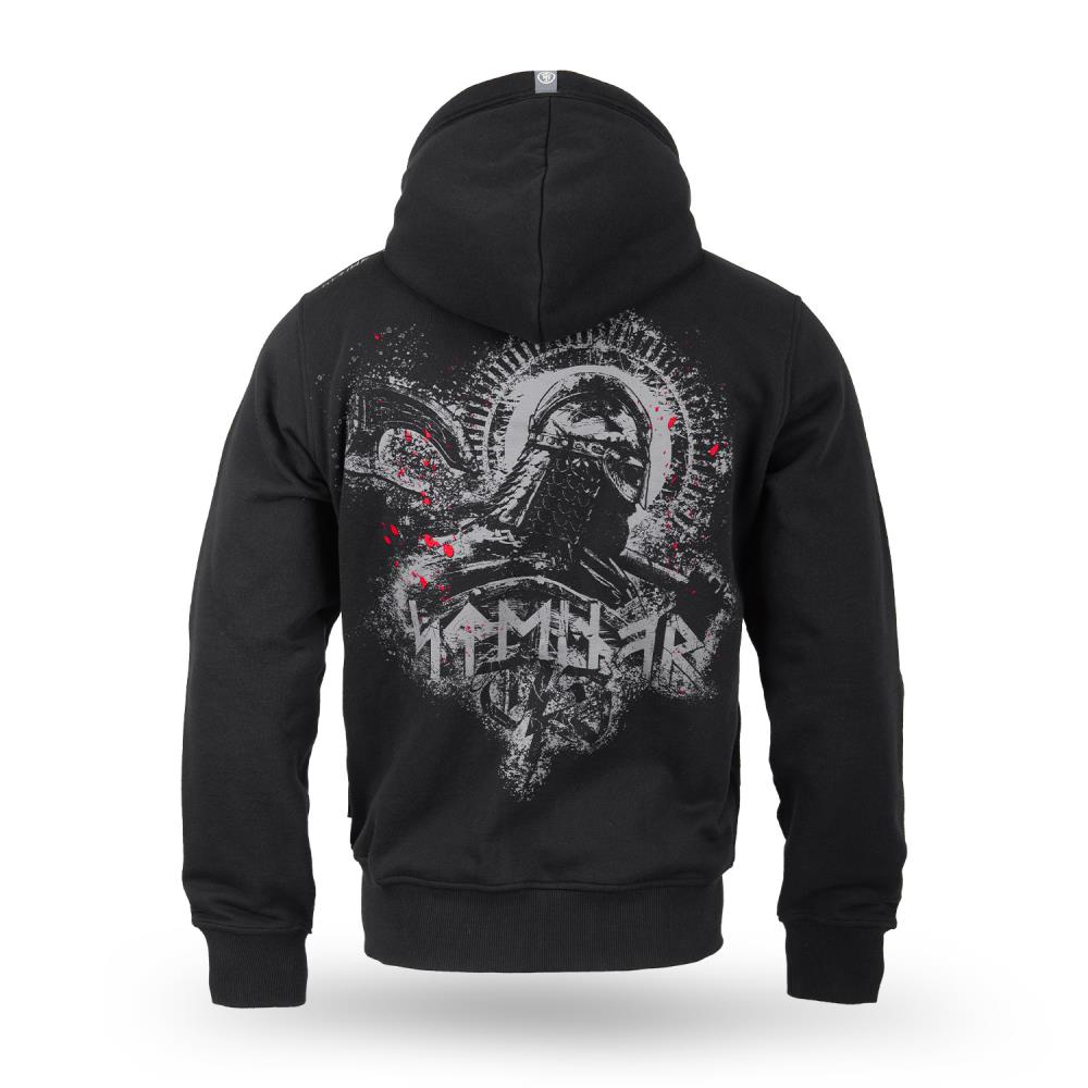 Mikina Thor Steinar s kapucí a vikingským motivem, dvojitě prošitá kapuce se štítkem na lemu, dolní lem a manžety rukávů jsou vyrobeny z kvalitního úpletu, dvě boční kapsy, pevný hlavní zip, velká aplikace potisku na zádech, vyšitý runový nápis na rameni, malé vyšité logo na hrudi, všitý štítek v bočním švu