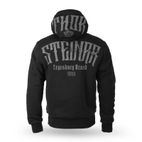 Pánská bonded bunda Kongeorn černá, zateplená mikina Thor Steinar na zip s kapucí, vyrobená z kvalitní bavlny a polyesteru, manžety a dolní lem jsou z robustního úpletu, kvalitní zip, podšívka z měkkého umělého kožíšku, dvě boční kapsy, velký potisk na zádech