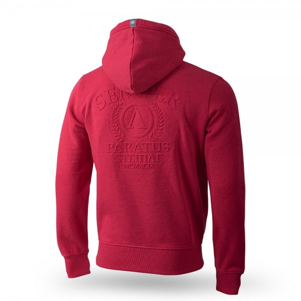 Pánská mikina Thor Steinar Semper Paratus II KPZJ 14259 rot - melange s kapucí a náročně zpracovaným motivem zad, tvořená embosovaným 3D silikonovým potiskem. Vyšívaný přední motiv; skrytý zip; Podšívka kapuce ; široké šňůry s tkaným štítkem