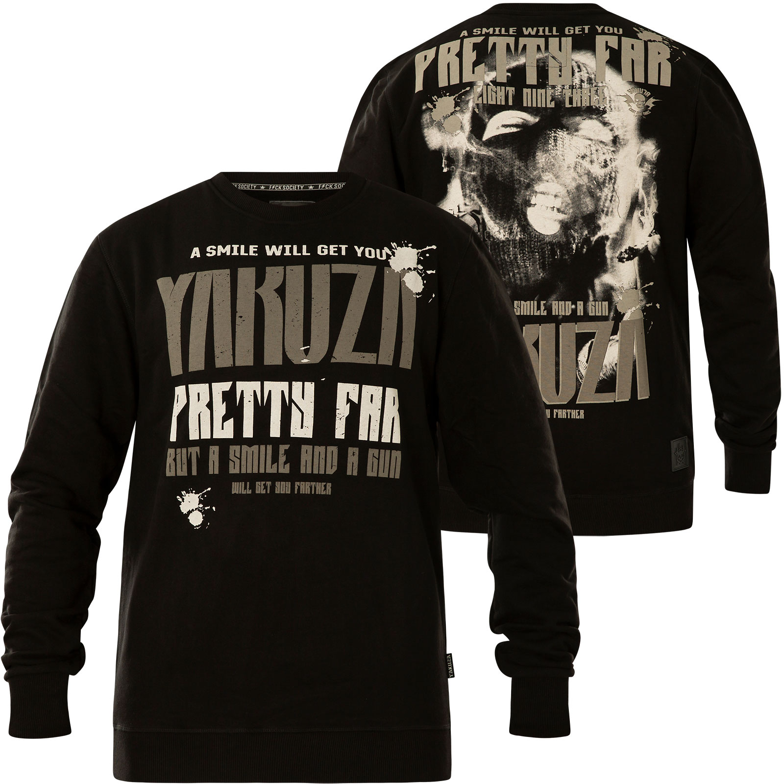 YAKUZA PRETTY FAR PULLOVER mikina s dlouhým rukávem má výstřih a žebrované manžety, límec a spodní lem. S vytištěnou grafikou, záložkou s logem Yakuza na bočním švu a nášivkou s logem na zadní straně.