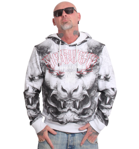 Pánské mikina Yakuza s kapucí, dvojitě prošitá kapuce, kulatý výstřih lemovaný úpletem, atraktivní motiv na přední i zadní straně, dolní lem a manžety jsou z kvalitního úpletu