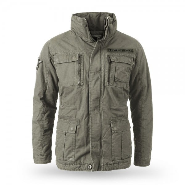Zimní bunda Thor Steinar "Bunda Kjartan" olivová, podšitý krátký parker, límec s vysokým výstřihem, vnitřní stahovací šňůrka, dvě boční kapsy a dvě našité náprsní kapsy uzavíratelné druky, uvnitř kapsa na zip a mobilní telefon, měkký polar fleece v kapsách, odnímatelná nášivka na suchý zip s výšivkou nad nohama náprsní kapsa a na nadloktí